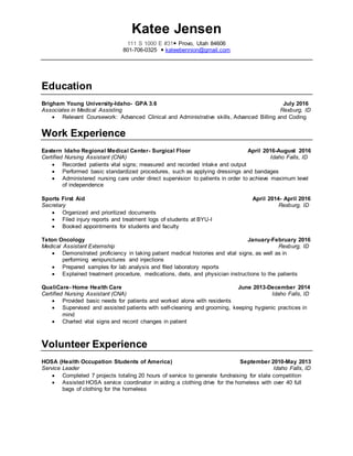 Katee Jensen has an Associate's degree in Medical Assisting from Brigham Young University-Idaho with a 3.6 GPA. She has worked in various medical roles including as a Certified Nursing Assistant at Eastern Idaho Regional Medical Center, an externship at Teton Oncology, and for Home Health Care companies. Jensen also has volunteer experience with HOSA, where she organized clothing drives and fundraising events.