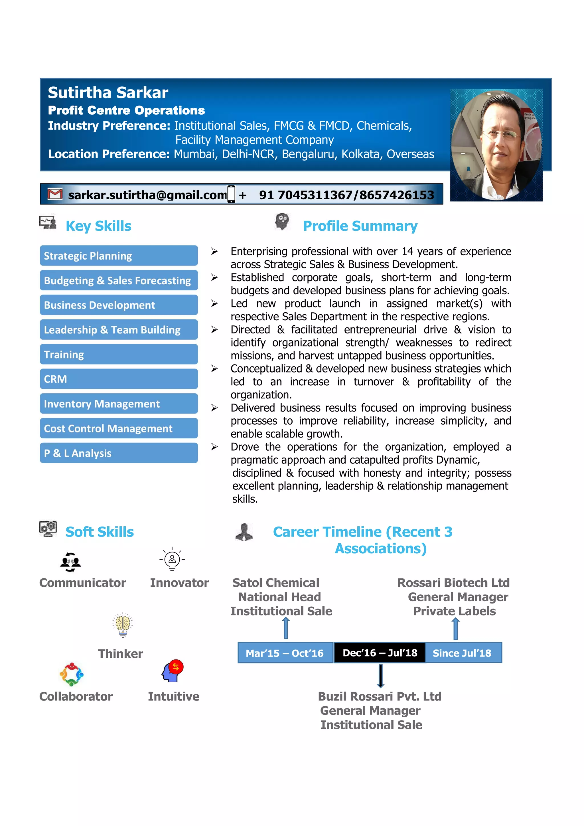The document outlines the professional profile of Sutirtha Sarkar, an experienced sales and business development expert with over 14 years in various industries, including institutional sales and FMCG. It details his career achievements, including leading significant product launches and driving notable revenue growth within several organizations. Additionally, the document includes his education, work experience, and personal details, highlighting his role as a general manager at Rossari Biotech Ltd and other previous positions.