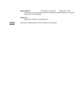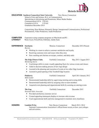 Michelle Bender graduated from Southern Connecticut State University with a B.A. in Communication specializing in advertising and promotions with a minor in media studies. She has experience using various computer programs and social media platforms. Her work experience includes positions at Starbucks, The Edge Fitness Clubs, Pinkberry, and The Gap where she demonstrated skills in customer service, event planning, leadership, and visual design. She was an active member of Lambda Pi Eta and Sigma Alpha Pi honor societies and made the Dean's List for three semesters.