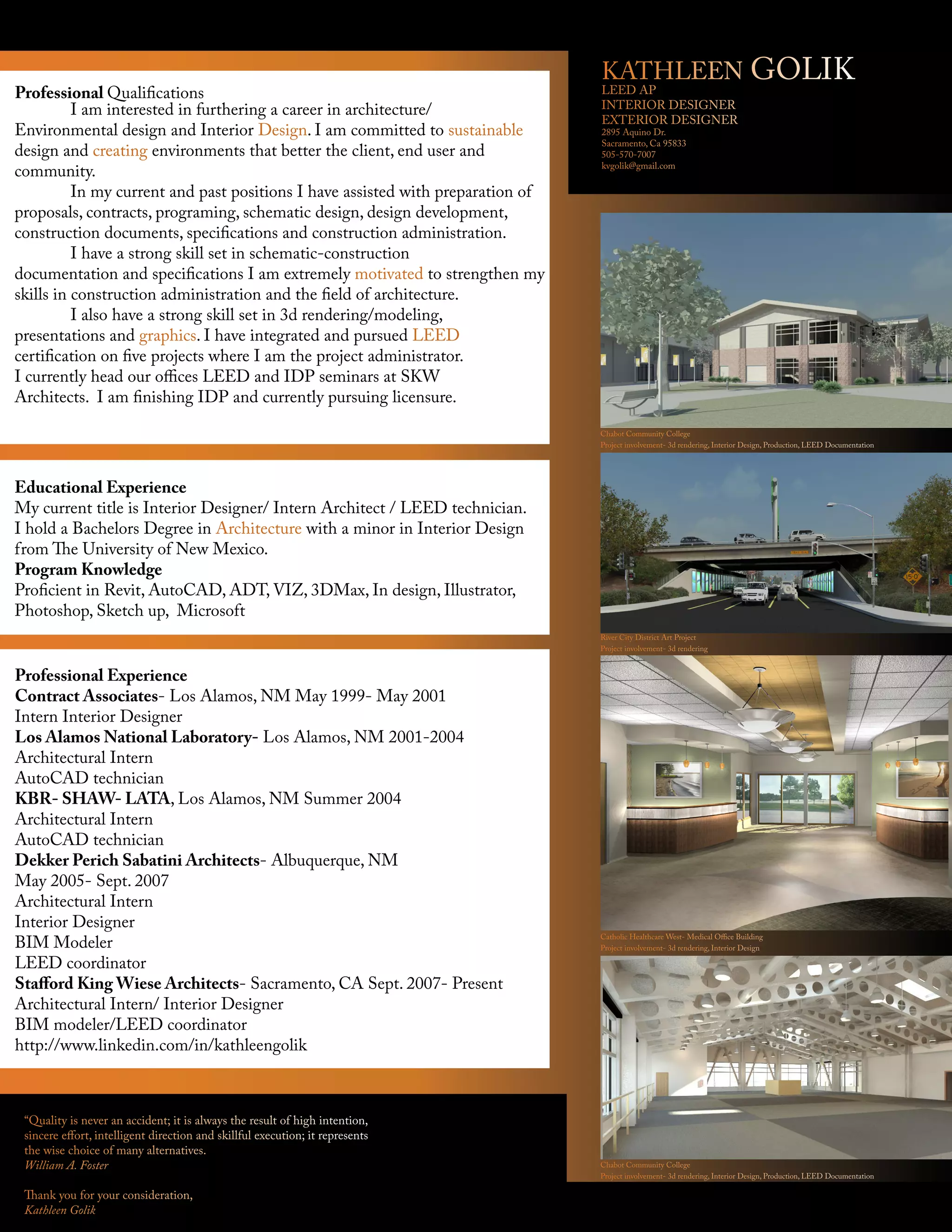 Kathleen Golik is an interior designer, LEED AP, and intern architect with over 15 years of experience in architecture and environmental design. She has experience in all phases of design and construction from proposals through construction administration. She is proficient in BIM modeling, 3D rendering, and sustainability certification. She is currently pursuing licensure and heads the LEED and IDP seminars at her current firm.