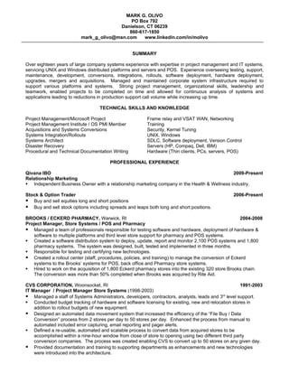 Mark Olivo has over 18 years of experience managing IT systems projects for large companies. He has expertise in project management, systems architecture, testing, support, and overseeing implementations of new technologies. His experience includes managing the conversion of systems during mergers and acquisitions.