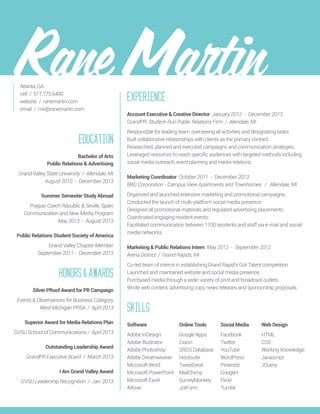 Rane Martin is a public relations professional from Atlanta, GA with experience in account management, marketing, and event planning. She holds a Bachelor of Arts in Public Relations and Advertising from Grand Valley State University. During her studies, she completed internships with student-run PR firm GrandPR and the Arena District in Grand Rapids. She has received several honors and awards for her work, including Silver and Superior awards from PR organizations. Her skills include proficiency with Adobe, Microsoft, and social media tools.
