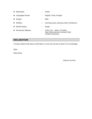 Gaurav Kumar is seeking a position that allows him to contribute his skills and grow with an organization working with latest technologies. He has an M.C.A. from KUK with 66% and pursued B.C.A. from KUK in 2011 with 59.07%. His skills include programming languages like C, C++, HTML, SQL, and Java basics as well as OS platforms like Windows and MS Office. He has strengths in teamwork, patience, and positive thinking.