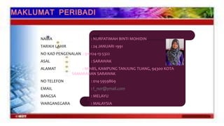 Dokumen ini mengandungi maklumat peribadi Nurfatimah binti Mohidin, termasuk latar belakang pendidikan dan pencapaian akademik serta penglibatan dalam aktiviti ko-kurikulum. Dia berkelulusan dari Universiti Malaya dengan PNGK 3.5 dan mempunyai pelbagai kemahiran serta pengalaman kerja. Selain itu, dia juga terlibat dalam kepimpinan di peringkat universiti dan sekolah.