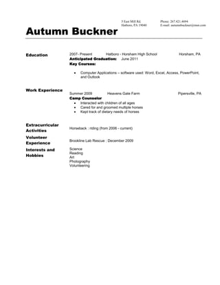 This document is a resume for a student graduating high school in June 2011 from Hatboro-Horsham High School in Horsham, PA. Their key courses included computer applications using various Microsoft software. They worked as a camp counselor at Heavens Gate Farm in summer 2009, where they interacted with children, cared for multiple horses, and tracked horse dietary needs. Their extracurricular activities included horseback riding since 2006 and volunteering at Brookline Lab Rescue in December 2009. Their interests included science, reading, art, photography, and volunteering.
