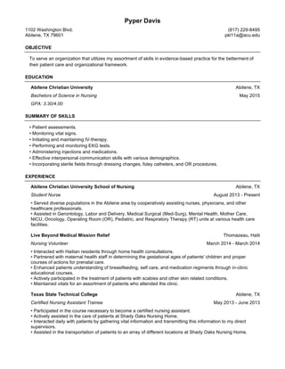 Pyper Davis is seeking an organization that utilizes her nursing skills to improve patient care and operations. She has a Bachelor of Science in Nursing from Abilene Christian University and experience in various medical settings including medical-surgical units, labor and delivery, and nursing homes. Her skills include patient assessments, vital sign monitoring, IV therapy, EKG tests, medication administration, and sterile procedures. She has also volunteered internationally providing prenatal care, health education, and treatment for skin conditions in Haiti.