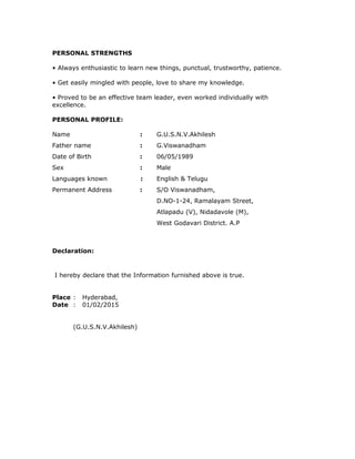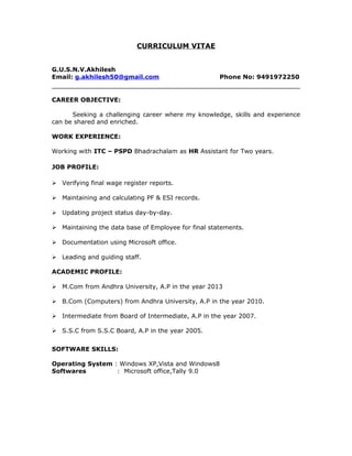 This curriculum vitae summarizes the qualifications and experience of G.U.S.N.V. Akhilesh. He has over two years of experience working as an HR Assistant for ITC - PSPD Bhadrachalam. His responsibilities included verifying wage reports, maintaining employee records, and updating project status. Akhilesh has a M.Com degree from Andhra University and is proficient in Microsoft Office applications and Tally 9.0. He aims to find a challenging career where he can contribute his knowledge and skills while continuing to learn and develop professionally.