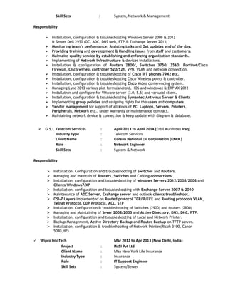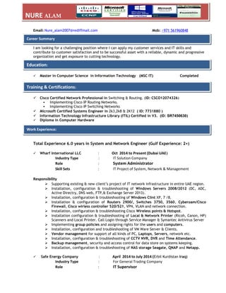 This document contains a resume for Nure Alam summarizing his work experience and qualifications. He has over 6 years of experience in system and network engineering roles. His experience includes installation, configuration, and troubleshooting of Windows servers, routers, switches, firewalls, and other network devices. He also has several technical certifications including Cisco CCNP, Microsoft MCSE, and ITIL Foundation. He is currently employed as a system administrator by Wharf International LLC in Dubai, UAE.