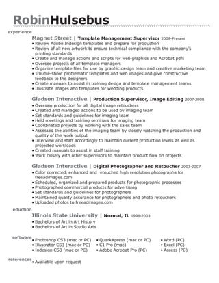 Robin Hulsebus has over 10 years of experience in template management, production supervision, digital imaging, and photography. She currently works as a Template Management Supervisor where she oversees projects, trains teams, and ensures technical compliance. Previously, she held production and photography roles at Gladson Interactive where she set standards, managed projects, and color corrected photographs. Robin has a Bachelor's degree in Art History and Studio Arts from Illinois State University.