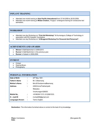 This document is a resume for Murugesan B who has a B.Tech in Fashion Technology. It summarizes his educational qualifications including a B.Tech from Kumaraguru College of Technology in Coimbatore with a 7 CGPA and work experience including positions at Priya Knit Fabs and SCM Garments. It also lists his skills, projects, workshops and achievements.