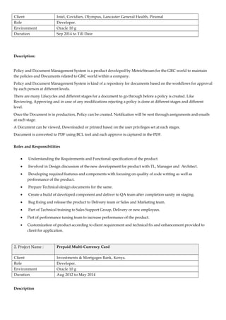 Dharmaraj is a software engineer with over 5 years of experience developing applications using Oracle PL/SQL. He currently works for MetricStream developing their Policy and Document Management System. He has experience in the banking domain with prepaid card solutions. His technical skills include Oracle 10g, 11g, Unix, and he has good knowledge of MasterCard prepaid processing and prepaid cards. He aims to enhance systems to meet user requirements and improve efficiency.