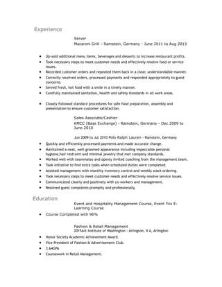 Ariel Carter is seeking a position in food service or retail. She has over 5 years of experience as a waitress and cashier/sales associate at various establishments including Macaroni Grill in Germany and the KMCC Base Exchange in Germany. She has also completed coursework in event and hospitality management, fashion and retail management. She is reliable, delivers exceptional customer service, has cash handling experience, and is a proven leader with strong communication and problem-solving skills.