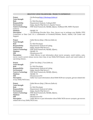 This document contains an individual's resume. It outlines their contact information, objective, qualifications, skills, experience and projects. The individual has over 6 years of experience in areas like PHP, MySQL, MVC patterns and frameworks like Zend and Magento. They have worked on e-commerce sites, mobile recharge portals and other projects using technologies like Linux, Apache and jQuery.