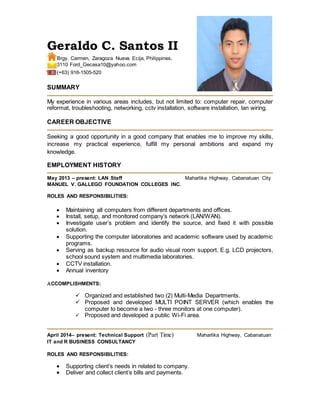 Geraldo C. Santos II is seeking a job that allows him to improve his IT skills. He has 5 years of experience in computer repair, networking, CCTV installation, and software troubleshooting. He is proficient in Microsoft Office applications and has an Associate's degree in Computer Technology.