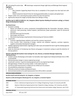 Srinivas Kumar has over 11 years of experience in design engineering, product development, research and development. He has expertise in Pro-E, CREO, Ansys and AutoCAD. Some of his projects include cylinder block and cylinder head design, turbocharger component design, and lubricating oil pump design for diesel engines. He is looking for a senior level role in design engineering or product development, preferably in the automobile industry.