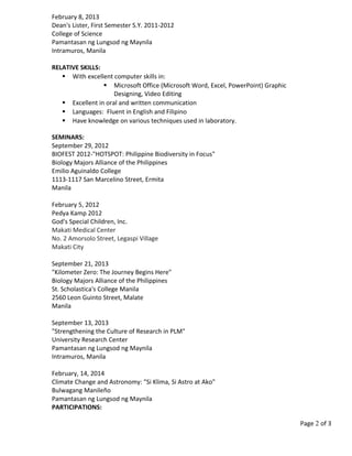 The document is a resume for Nicaela Apelizan Sevilla. It summarizes her career objective, educational background, skills, seminars/participations, and references. Her objective is to obtain a job utilizing her skills and knowledge to help a company while gaining experience. She has a Bachelor's degree in Biology from Pamantasan ng Lungsod ng Maynila and attended secondary and primary schools in Manila. Her skills include Microsoft Office, graphic design, video editing, and laboratory techniques. She has participated in biology seminars and was part of the PLM Biological Society.