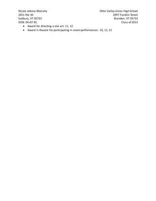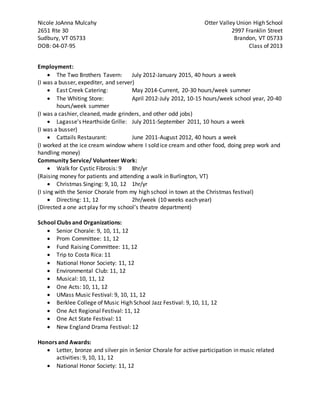 Nicole JoAnna Mulcahy has held several part-time jobs in food service and retail over the past few years, working up to 40 hours per week. She has also been actively involved in her high school's music, theater, and environmental programs, directing a play and participating in numerous musical festivals and competitions. In addition, Nicole volunteers annually for cystic fibrosis fundraising events and sings with her school's chorale at a local Christmas festival.