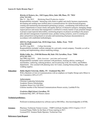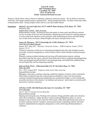 Lauren B. Taylor is seeking a pharmacy technician position and has experience working as a pharmacy technician trainee. She has strong customer service, communication, and computer skills developed over previous roles at various retail stores. Taylor graduated from Dallas Baptist University with a Bachelor's degree in Communications and a minor in Art.