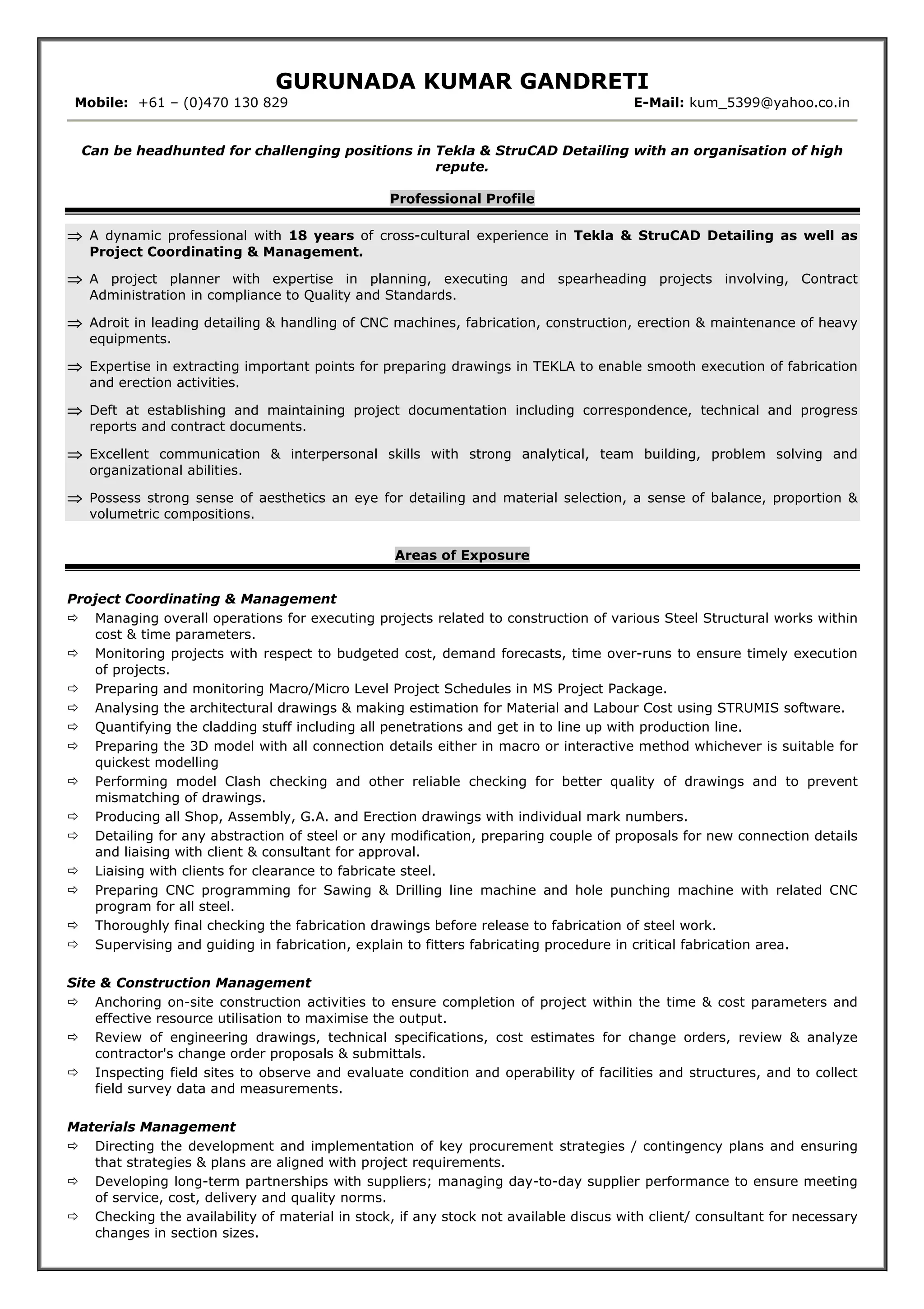 Gurunada Kumar Gandreti has 18 years of experience as a structural detailer using Tekla and StruCAD. He has worked on projects in Australia, India, Ireland, Canada, and Papua New Guinea. Some of his responsibilities have included planning projects, leading detailing teams, preparing 3D models and drawings, and ensuring quality. He is skilled in materials estimation, CNC programming, fabrication, and project coordination.