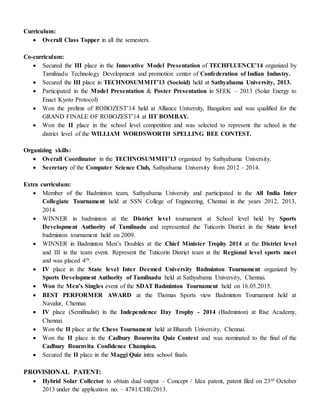 This document contains the resume of Ashwin J highlighting his academic qualifications, certifications, areas of interest, achievements and projects. It summarizes that he has a B.E. in Mechanical Engineering from Sathyabama University with various technical and language certifications. It also lists his achievements like awards won, publications, and extracurricular activities focused on badminton and social work. His career objective is to apply knowledge in new technologies and be a good team player.