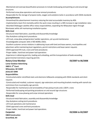 This document is a resume for Mark Holstrom. It summarizes his work experience which includes roles as a rotary crew leader, rotary crew member, carpenter, automotive technician, and heavy wheeled vehicle mechanic in the U.S. Army. It also lists his skills and abilities such as leadership, mechanical aptitude, equipment operation and maintenance experience, and computer proficiency. His objective is seeking a career with potential for growth in maintenance or diagnostics.