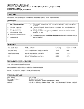 Amrinder Singh is pursuing an MBA from PCTE in Ludhiana with specialization in finance. He has a BSc degree from S.C.D Government College and is seeking to develop his skills for a career in the financial sector. He has strengths in core financial competencies, academics, interpersonal skills, and is dedicated, hardworking, and enthusiastic.