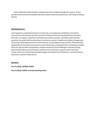Nicole Storey-Batiste is seeking a full-time nursing position and has experience working in community healthcare, mental health care, and Christian care facilities. She has a variety of nursing skills including blood draws, IVs, medication administration, patient assessments, documentation, and procedures. Nicole is certified in phlebotomy and has experience with waived lab tests, immunizations, diabetic management, and starting IVs. She is currently attending Pierce College online to complete her BSN.