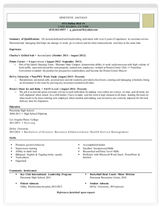 Genevieve Gacusan has over 4 years of experience in customer service roles including as an associate at Charley's Grilled Sub and supervisor at Potato Corner where she helped with the grand opening of a new location. She is currently a shift leader at Brian's Shave Ice and Boba where she provides excellent customer service and leads a team. Genevieve is studying for a Bachelor's degree in Business Administration with a focus on Health Service Management at DeVry University while maintaining strong community involvement.