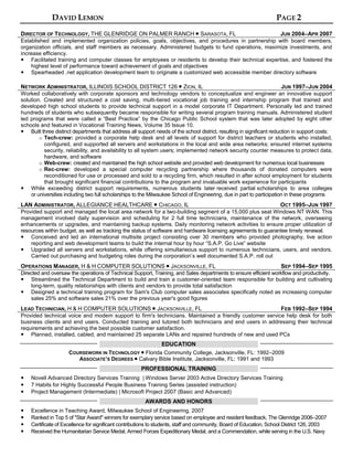 David Lemon is an IT operations senior management specialist with over 25 years of experience managing IT operations and security. He has extensive technical skills and experience leading teams. His career includes positions as an IT operations and security manager, director of technology, network administrator, and other roles. He has a proven track record of successfully completing projects on time and within budget.