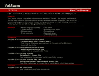 This document is a resume for Alberto Perez Hernandez. It summarizes his background as a graphic designer with experience in television doing audiovisual interfaces, designing advertisements for small businesses and theater productions. He has skills in programs like Photoshop, Illustrator, After Effects, InDesign and Flash. His resume provides details on his work experience including as creative director at a design studio in Mexico and as a graphic designer for magazines and television channels in Cuba.