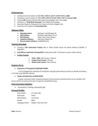 Praveen Kumar R is a quality engineer with a B.E. in Mechanical Engineering and has been working at Hinduja Foundries since 2013. He is experienced in quality management, process improvement, and has certifications in ISO standards. His skills include CAD software, project management, and training in various technical areas.