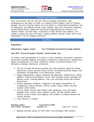 Raphael Sanders is seeking a position as a Computer Systems Engineer or IT Technical Manager. He has experience in software/hardware installation, data migration, network implementation and management. His resume lists his current role as an Infrastructure Support Analyst and past roles including Help Desk Analyst, Technician I, Systems Engineer, and Computer Lab Technician II. He has several years of experience in technical roles and education includes a Master's degree and professional certifications.