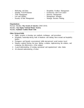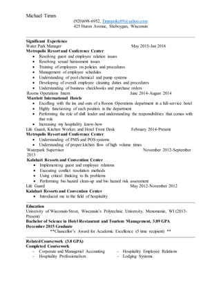 Michael Timm has extensive experience in various roles within the hospitality industry such as water park manager, rooms operations intern, life guard, kitchen worker, and hotel front desk worker. He has a bachelor's degree in Hotel Restaurant and Tourism Management from University of Wisconsin-Stout with a 3.89 GPA and is graduating in December 2015. His experience includes resolving guest and employee relations issues, implementing policies and procedures, managing employee schedules, and understanding business systems. He is proficient in hospitality leadership, situation analysis, and value chains.
