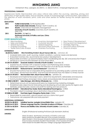 Mingming Jiang has over 10 years of experience in textile merchandising, sales, and global sourcing. She has a Master's degree in International Hospitality Management from the University of South Carolina and a Bachelor's degree in Marketing from Northwest University of Politics and Law in China. Her experience includes roles in merchandising, sales management, international tourism, and hospitality. She is proficient in English and is a native Mandarin speaker.