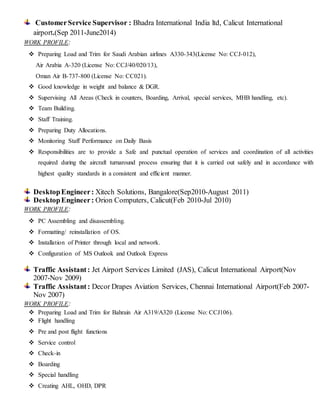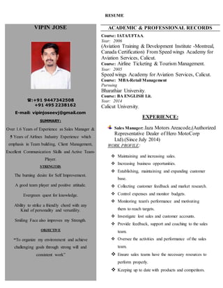 Vipin Jose is a sales manager with over 1.6 years of experience as well as 5 years of experience in the airline industry. He has strengths in team building, client management, communication skills, and a positive attitude. His objective is to organize his environment and achieve goals through strong will and work. He has an MBA in retail management and experience in roles such as customer service supervisor, desktop engineer, and traffic assistant in the airline industry.