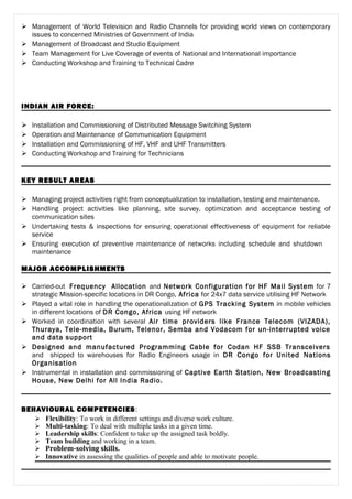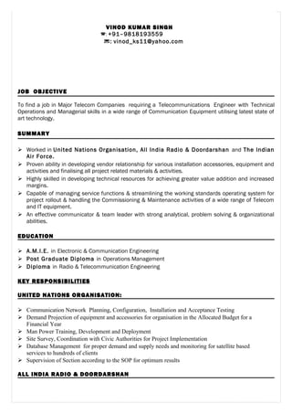 The document is a resume for a telecommunications engineer seeking a job requiring technical operations and managerial skills in communications equipment. It summarizes the candidate's experience working for organizations like the United Nations, All India Radio, and the Indian Air Force, and outlines responsibilities like network planning, equipment installation, maintenance, and training. It also lists the candidate's education in electronic and communications engineering, and highlights accomplishments like designing frequency allocation systems and cable for communications devices.