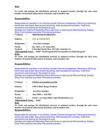 Yashpal Singh has over 14 years of experience in sales for OTC and cosmetics companies. He currently works as an Area Sales Manager for Piramal Enterprises in Delhi and Haryana. Previously he held sales roles at Paramount Cosmetics, Modi Revlon, and Pristine Care Products. He is seeking new opportunities in sales management.