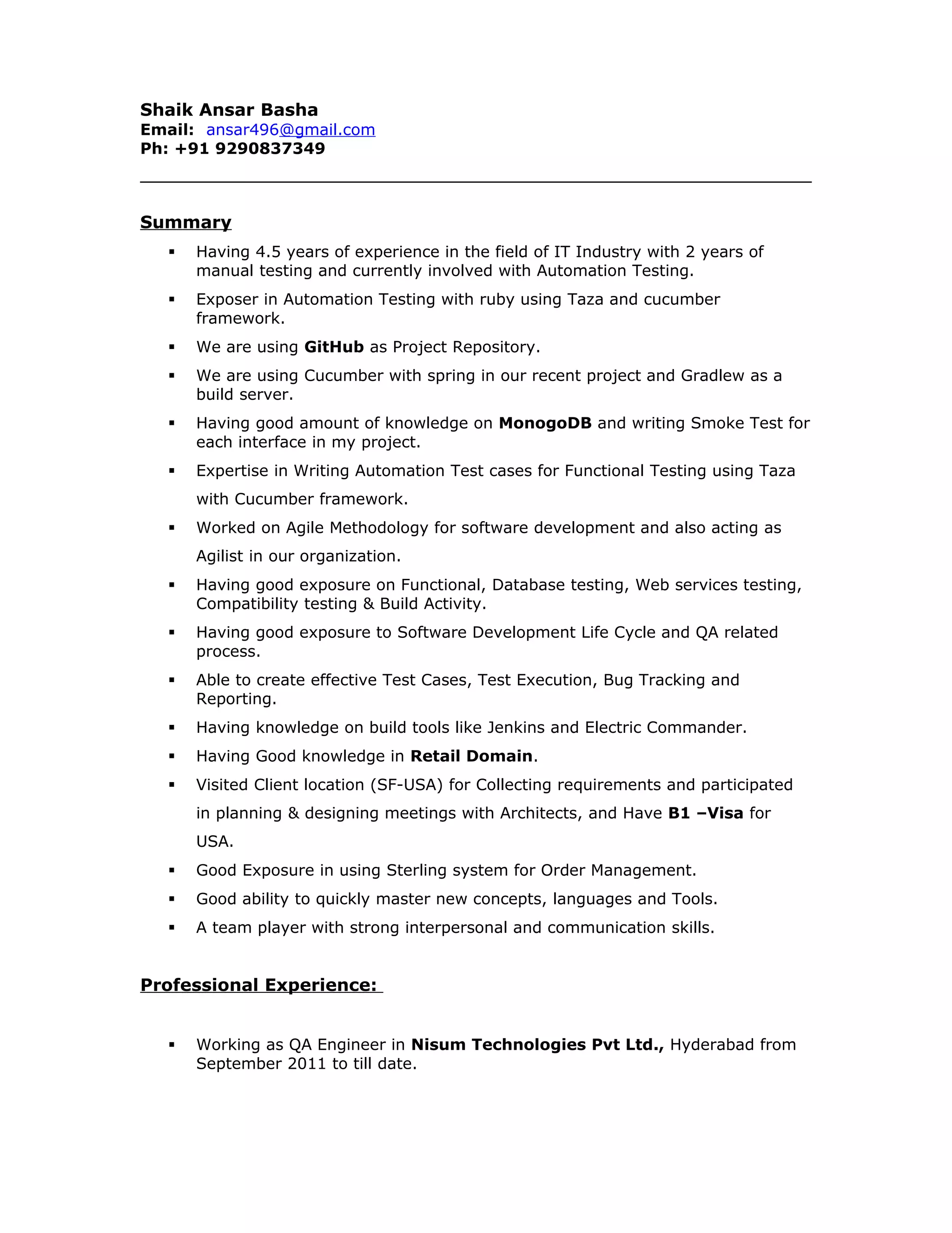 Shaik Ansar Basha is a QA engineer with over 4 years of experience in manual and automation testing. He has expertise in test automation using Ruby, Cucumber and Taza frameworks. He has worked on projects for Gap Inc. in the US involving order management, warehouse management and ecommerce systems. Currently he is working on a project replacing IBM Sterling applications for Gap using Java, Spring and MongoDB.