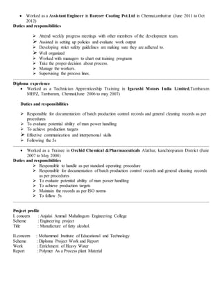 Aanand.R is seeking a challenging position as a Chemical Engineer. He has over 7 years of experience in engineering roles including as an Electroplating Production Engineer, QC Engineer, and Assistant Engineer. He has a B-Tech in Chemical Engineering and has worked on projects involving the manufacture of fatty alcohol and enrichment of heavy water.