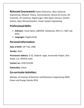 Pranay Kumar is currently pursuing his B.Tech in Electrical and Electronics Engineering from VIT University in Vellore, Tamil Nadu, India. He has experience with software like Visual Spice, LABVIEW, Solidworks, DEV C++, and MAT Lab Xilinx. His objective is to explore his potential in engineering and manufacturing where he can apply his technical skills.