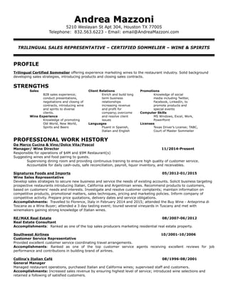 Andrea Mazzoni is a trilingual certified sommelier and sales representative with extensive experience in the wine and spirits industry, specializing in B2B sales and client relations. She has held various managerial roles in restaurants, overseeing operations and developing effective sales strategies, while also being fluent in Spanish, Italian, and English. Mazzoni has a solid educational background in hotel restaurant management and has achieved notable success in increasing sales and customer satisfaction.