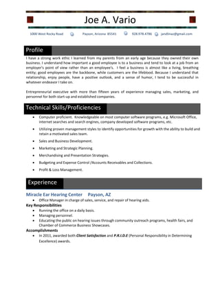 This document is a resume for Joe A. Vario. It summarizes his professional experience including as Office Manager for Miracle Ear Hearing Center in Payson, AZ and as Assistant Branch Manager for Enterprise Rent-A-Car in Payson, AZ. It also lists his education as a Bachelor of Science in Business Administration from the University of Nevada, Reno with majors in Finance and Economics and a minor in Computer Science. His technical skills include proficiency with Microsoft Office and experience with sales, marketing, personnel management, and small business insurance.