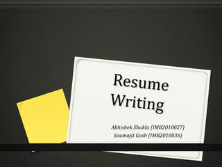 The document provides tips and guidelines for writing an effective resume. It discusses the purpose of a resume as a marketing tool to get an interview. It covers various resume formats, sections including objectives, experience, education, and skills. The document emphasizes using concise, relevant information and action words to highlight achievements. It also provides advice on cover letters, references, formatting and common mistakes to avoid.