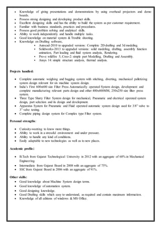 Durgesh Yadav is a design engineer currently working at Jasubhai Engineering Pvt Ltd with over 5 years of experience. He has a Bachelor's degree in Mechanical Engineering and is proficient in CAD software like AutoCAD, Solidworks, and Pro-E. Some of his responsibilities include managing projects from design to production, providing technical solutions to customers, and training junior engineers. He has experience designing material handling equipment, weighing and bagging machines, filter presses, and piping systems.