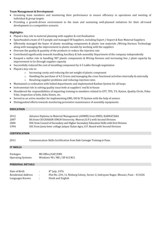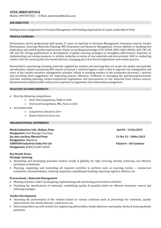 Atul Shrivastava is seeking senior assignments in purchase management with leading organizations, preferably in Pune. He has over 21 years of experience in purchase management, inventory control, vendor development, sourcing, materials planning, and MIS generation. Some of his accomplishments include winning inter-unit and unit-level competitions and receiving long service and kaizen awards. He has worked in purchase roles for various companies since 1994 and is currently the plant head at AIMPEEM Industries India Pvt Ltd.