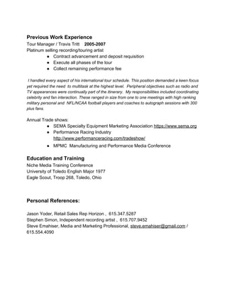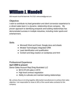 William J. Mandell is seeking a sales position that allows him to utilize his experience in lead generation and client conversion. He has a proven track record of identifying prospects and building relationships that has led to success in industries like motor sports and entertainment. His skills include Microsoft Office, CRM systems, lead qualification, and content creation. Mandell's professional experience includes over 15 years in senior sales roles, where he was responsible for close to 50% of sales contracts at one company and handled all aspects of touring logistics as a tour manager for a platinum recording artist. He is well-educated and has references available.