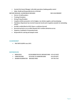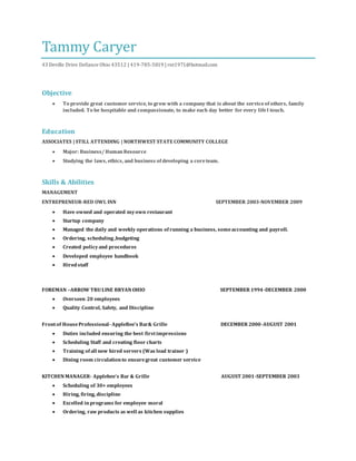 Tammy Caryer is seeking a position that allows her to provide great customer service and grow with a company focused on serving others. She has over 15 years of experience managing teams in restaurant and long-term care facility settings. Currently, she is the Dietary Manager at GlennPark of Defiance, where she oversees 10 staff members and ensures high quality service through training, budget management, and community events. Tammy is continuing her education in business and human resources at Northwest State Community College.