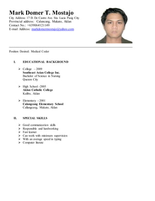 Mark Domer T. Mostajo is applying for a position as a medical coder. He has over 5 years of experience in medical coding, pre-authorization, and pharmacy benefits analysis. His educational background includes a Bachelor of Science in Nursing degree. He is proficient in ICD and CPT coding, has strong communication skills, and is computer literate.