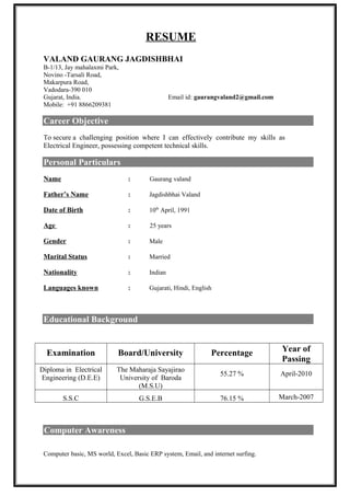 Gaurang Valand is an electrical engineer seeking a challenging position to contribute his skills. He has over 5 years of experience in testing and quality control of electrical equipment like transformers and voltage stabilizers. Currently, he works as a Testing & QC Engineer at TSI ELECPOWER, where he is responsible for material checking, electrical testing, quality control, planning, and record keeping. Previously he has worked as a Testing Engineer and Production and Testing Engineer at two other companies involved in transformer manufacturing. He has expertise in routine testing, planning and execution of tests, work scheduling, and repairing of distribution transformers.