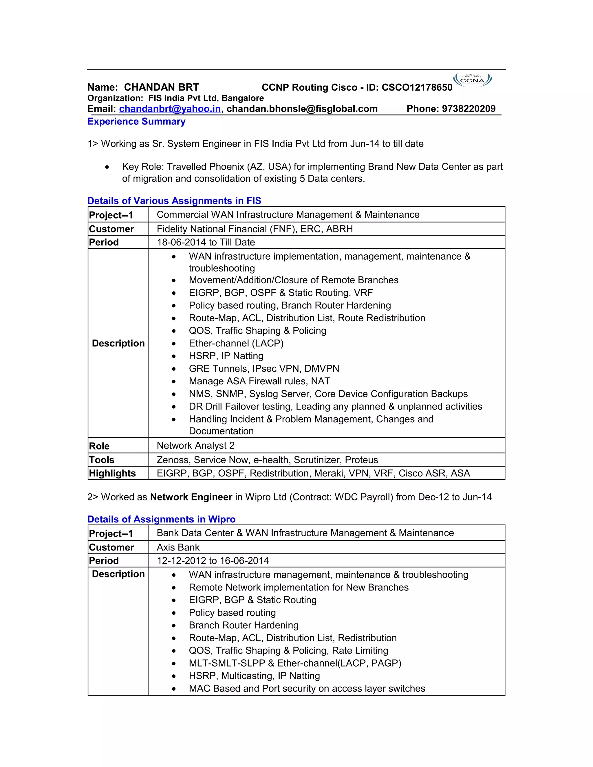 Chandan BRT has over 10 years of experience in networking roles including as a senior system engineer, network engineer, and network analyst. He has extensive experience implementing, managing, and troubleshooting WAN infrastructures using protocols like EIGRP, BGP, OSPF, and VPN technologies. Currently he works as a network analyst for FIS India where he helped implement a new data center migration project in Phoenix, AZ.